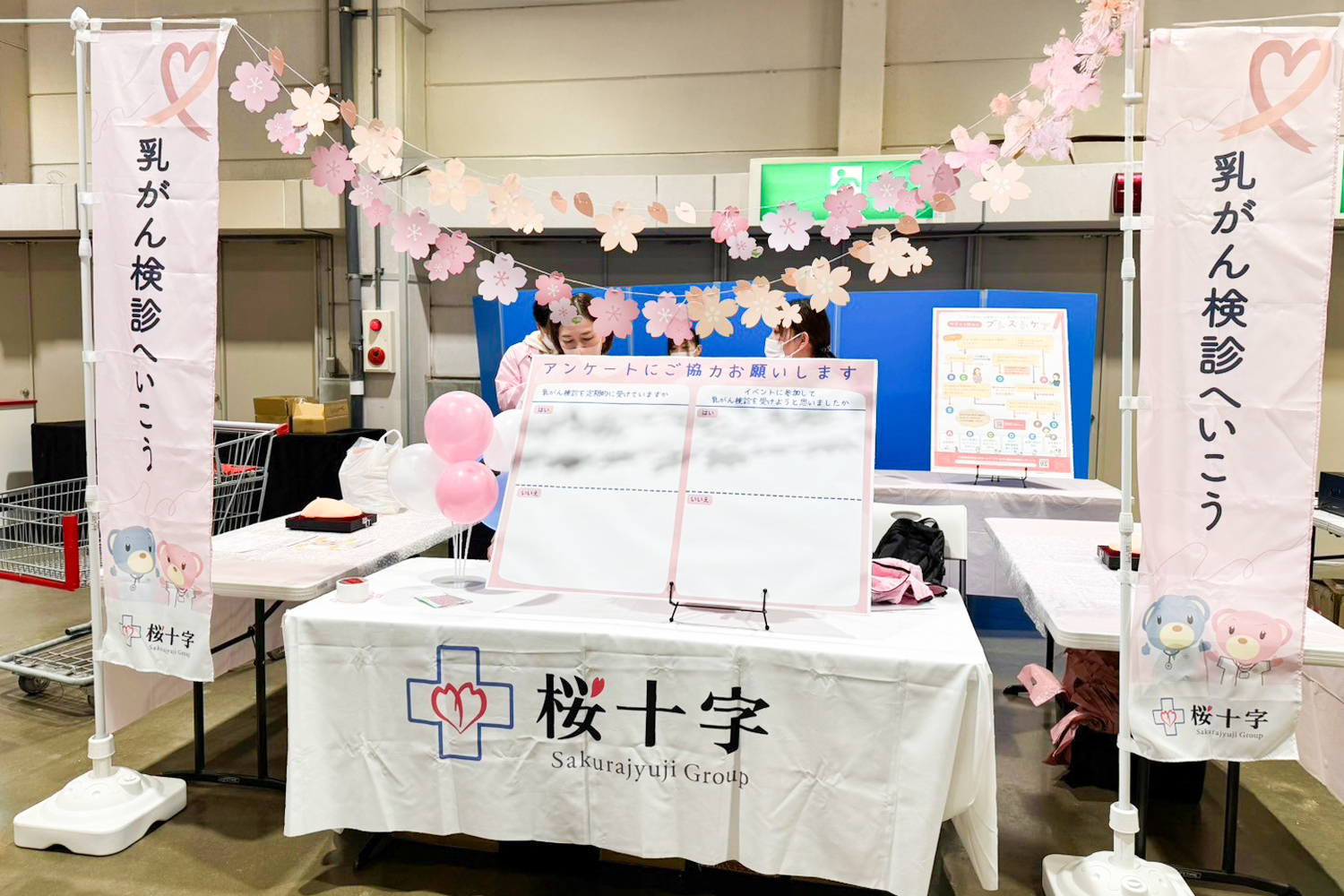 イベント当日の3月15日(土)は、冷たい雨が降るあいにくの天気でしたが、朝から多くのお客様にお立ち寄りいただきました。コストコ久山倉庫店内に設けた桜十字ブースには、桜十字福岡病院の健診部門とリハビリ部門が出展し、それぞれ乳がん触診体験と体力測定イベントを開催しました。